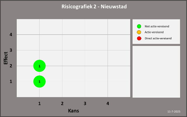 In de vorige voortgangsrapportage van 1 januari 2025 is al benoemd: “De risico’s zijn allemaal verkleind of niet meer van toepassing. Gezien de huidige fase van het project, met geringe projectrisico's zal dit het laatste risicodossier zijn wat voor het project wordt gemaakt.” Voor het maken van deze voortgangsrapportage is de risicoanalyse nog eenmaal bijgewerkt, resulterend in bovenstaande risicografiek. Dit is de laatste risicoanalyse.