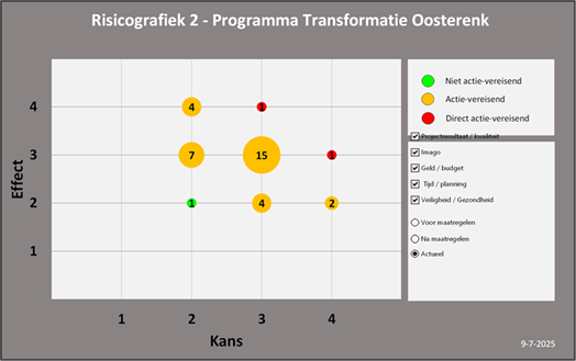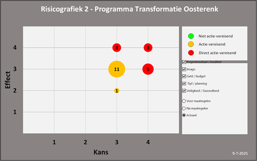 Het risicoprofiel Oosterenk is te kwalificeren als gemiddeld. Het betreft hier een gebiedsontwikkeling waarbij de gemeente beperkt positie heeft. De impact op imagoschade en kwaliteit van de leefomgeving voor de bewoners van de circa 570 nieuwe woningen in het Centrumgebied van Oosterenk kan groot zijn als het programma geen vervolg krijgt. Een groot risico is de stagnatie van de bouw door marktomstandigheden. Ten opzichte van een half jaar geleden zien we beperkte wijzigingen in het risicoprofiel. Grootste relevante wijziging in de context is dat de gemeenteraad het Ruimtelijk Toekomstperspectief begin juli jl. heeft vastgesteld. Dit toekomstperspectief heeft impact op het gebied en wij zullen dit dan ook betrekken bij het af te ronden ontwikkelkader Oosterenk.