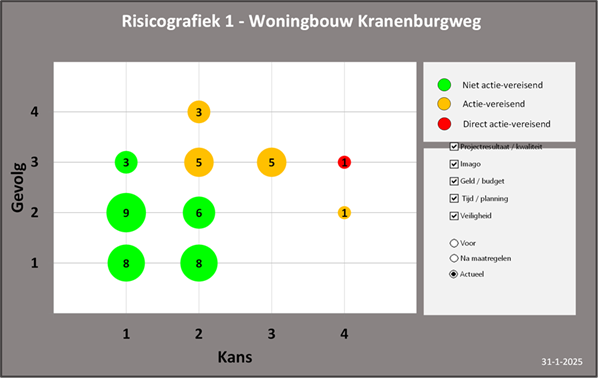 De grootste risico’s zijn voornamelijk gerelateerd aan de planning. Dit betreft eventuele zienswijzen en beroep tegen de wijziging van het Omgevingsplan. Maatregelen om dit risico te mitigeren hebben voornamelijk betrekking op een goede afstemming met omwonenden en andere belanghebbenden. Hier is volop op ingezet. Daarnaast is het risico aanwezig dat niet binnen de afgesproken planning met initiatiefnemer gekomen kan worden tot toetsing, behoordeling, afstemming etc. De beschikbare capaciteit binnen de gemeente is hierin een aandachtspunt. Door de planning en verwachtingen hieromtrent duidelijk kenbaar te maken moet dit risico afnemen. Het verlies van kennis is eveneens een risico wat invloed op de planning kan hebben. Waarborgen van continuteit binnen dit project is hiervoor van belang.